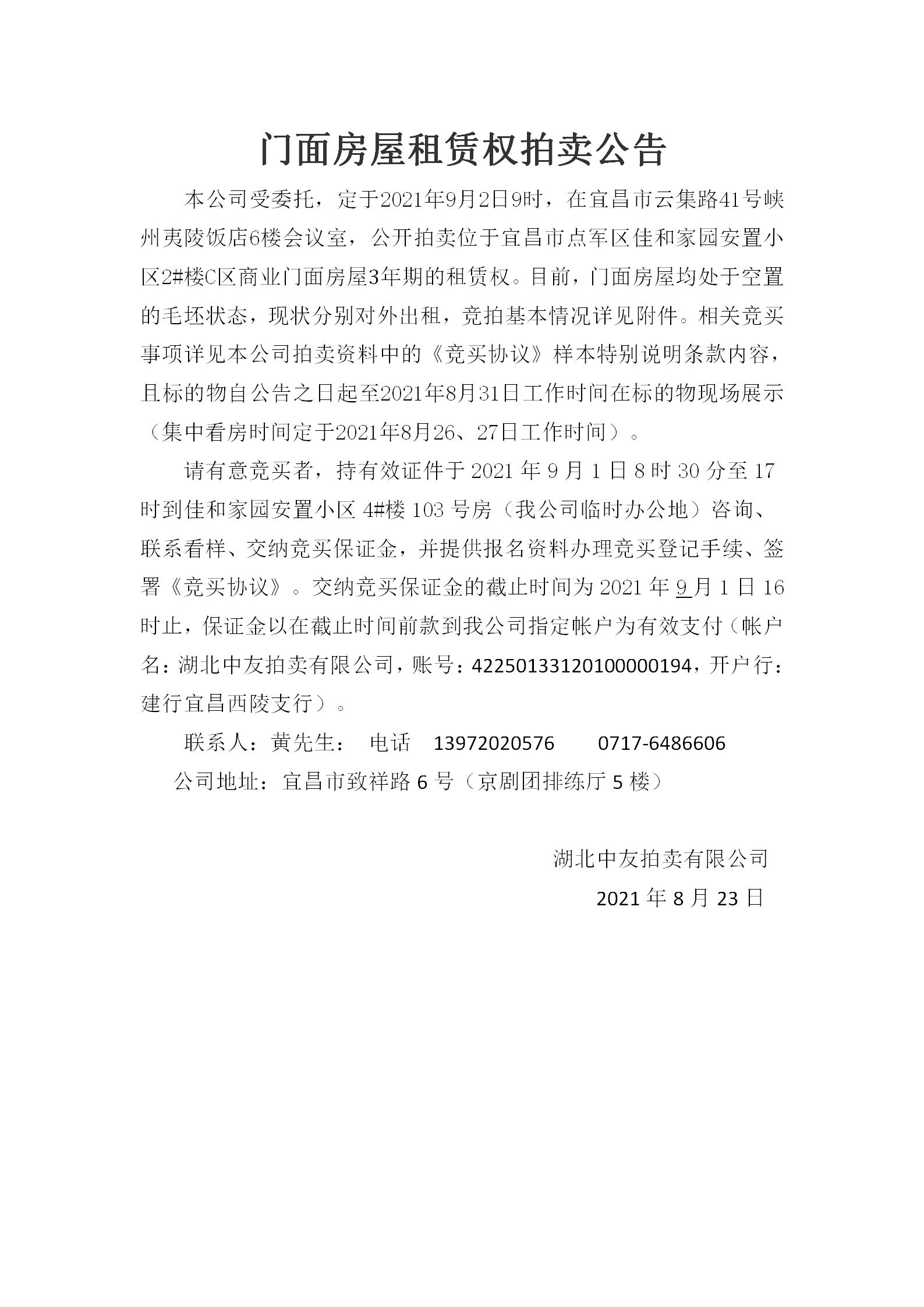 (通訊員周琴、彭曉燕)點(diǎn)軍區(qū)佳和家園安置小區(qū)2#樓C區(qū)商業(yè)門面房屋是點(diǎn)軍區(qū)國資局授權(quán)宜昌點(diǎn)盛投資開發(fā)有限公司經(jīng)營管理的安置房商業(yè)資產(chǎn),目前該項目正在開展租賃權(quán)競拍工作,競拍公告已發(fā)布點(diǎn)軍區(qū)人民政府網(wǎng),現(xiàn)將公告內(nèi)容公布如下: