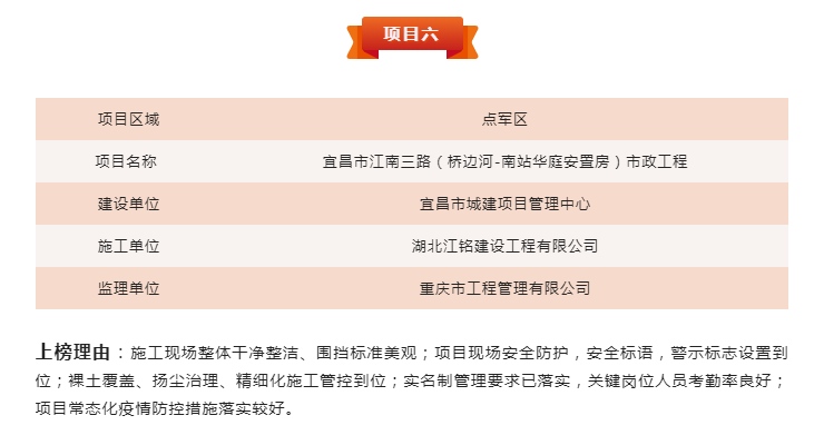 (通訊員:徐文剛、吳鵬翔)為進(jìn)一步貫徹落實(shí)《宜昌市揚(yáng)塵污染防治條例》《宜昌市城區(qū)建設(shè)工程文明施工管理紅黑榜制度(試行)》,強(qiáng)化建筑工地文明施工管理,壓實(shí)建設(shè)單位文明施工主體責(zé)任,鼓勵(lì)文明施工先進(jìn)典型,打擊和曝光不文明施工違法行為,結(jié)合建筑工地實(shí)名制管理、關(guān)鍵崗位人員到崗履職相關(guān)要求,宜昌市住建局組織評(píng)選了2022年第七期建筑工程安全文明施工管理“紅黑榜”。點(diǎn)盛投資開(kāi)發(fā)有限公司代建項(xiàng)目江南三路,成為點(diǎn)軍區(qū)唯一獲評(píng)紅榜的市政項(xiàng)目。