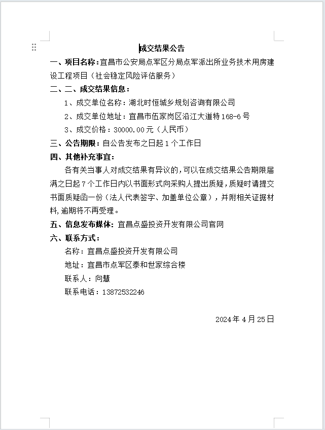 宜昌市公安局點(diǎn)軍區(qū)分局點(diǎn)軍派出所業(yè)務(wù)技術(shù)用房建設(shè)工程項(xiàng)目(社會穩(wěn)定風(fēng)險(xiǎn)評估服務(wù))成交公告