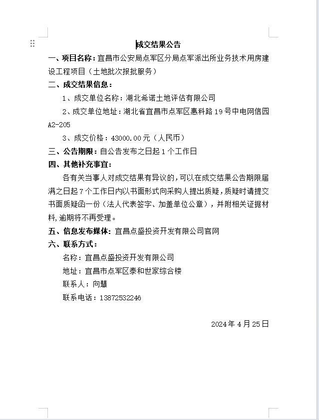 宜昌市公安局點軍區(qū)分局點軍派出所業(yè)務(wù)技術(shù)用房建設(shè)工程項目 (土地批次報批服務(wù))成交公告