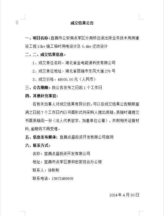 宜昌市公安局點軍區(qū)分局橋邊派出所業(yè)務(wù)技術(shù)用房建設(shè)工程10kv施工臨時用電設(shè)計及0.4kv遷改設(shè)計成交公告