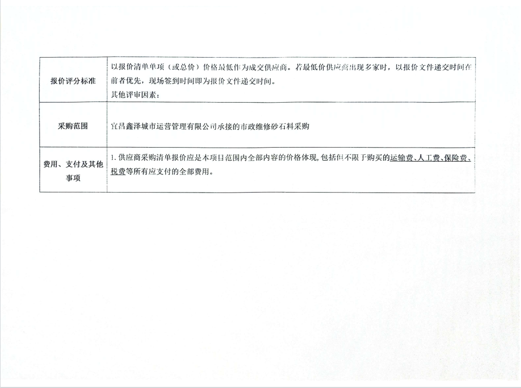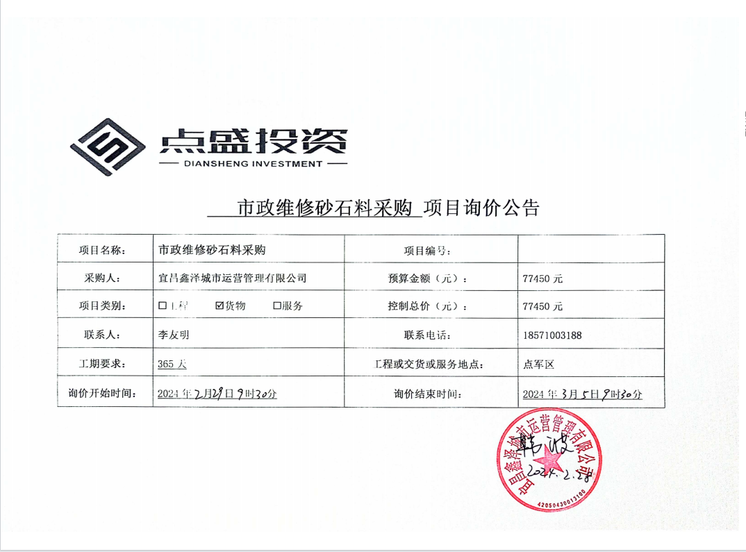 宜昌鑫澤城市運(yùn)營(yíng)管理有限公司市政維修砂石料采購(gòu)項(xiàng)目詢價(jià)公告