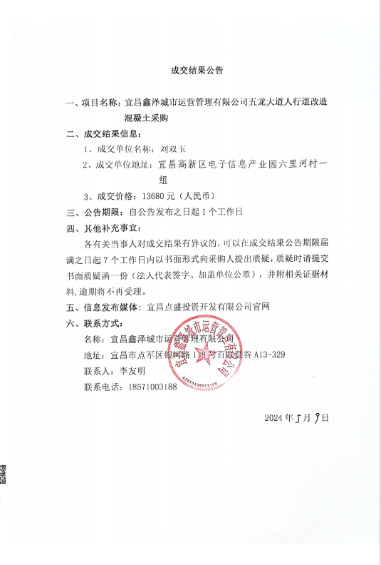 五龍大道人行道改造混凝土采購項目成交公告