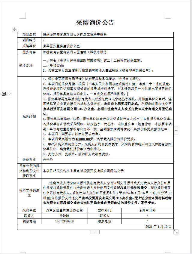 錦繡城南安置房項目A區(qū)建筑工程秩序服務詢價公告