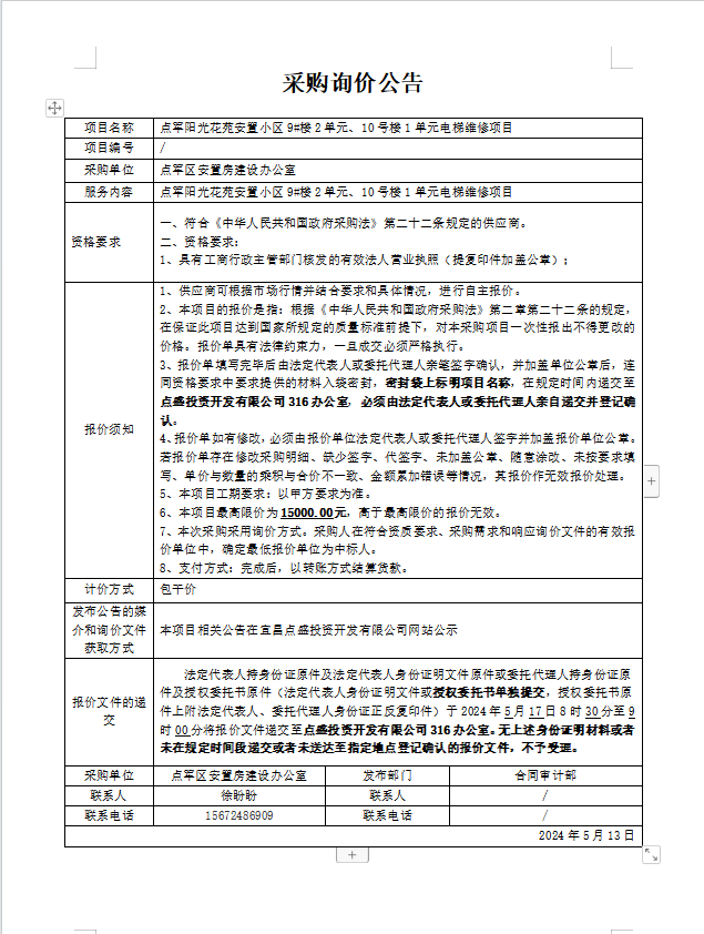 點(diǎn)軍陽(yáng)光花苑安置小區(qū)9#樓2單元、10號(hào)樓1單元電梯維修項(xiàng)目詢價(jià)公告