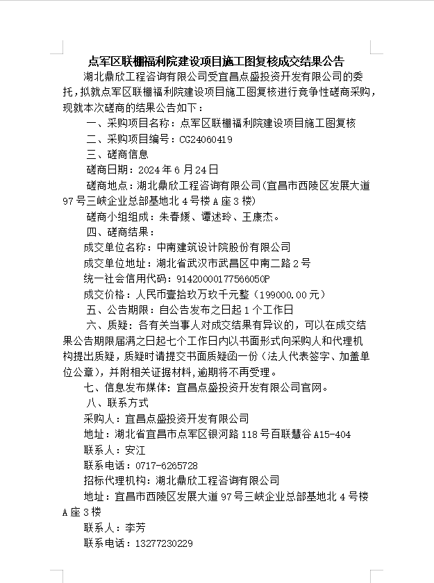 點(diǎn)軍區(qū)聯(lián)棚福利院建設(shè)項目施工圖復(fù)核成交結(jié)果公告
