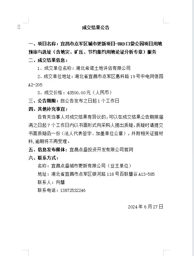 宜昌市點(diǎn)軍區(qū)城市更新項目-URD口袋公園項目用地預(yù)審與選址(含地災(zāi)、礦壓、節(jié)約集約用地論證分析專章)服務(wù) 成交公告