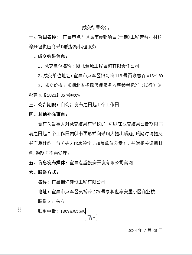 宜昌市點軍區(qū)城市更新項目(一期)工程勞務(wù)、材料等分包供應(yīng)商采購的招標(biāo)代理服務(wù)成交結(jié)果公告