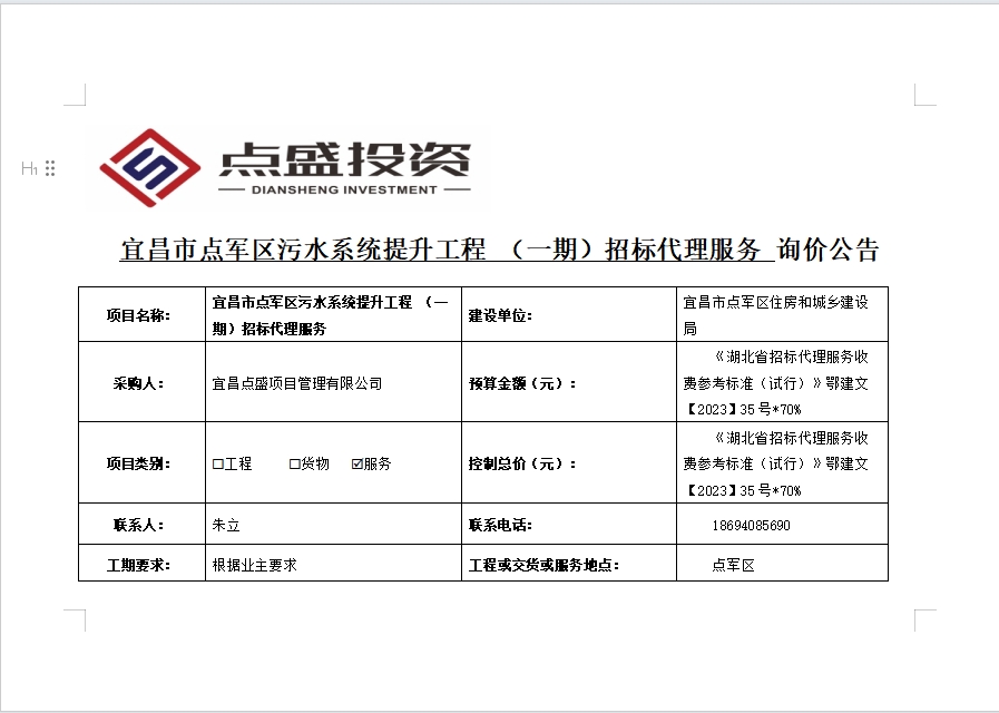 宜昌市點軍區(qū)污水系統(tǒng)提升工程 (一期)招標代理服務(wù)詢價公告