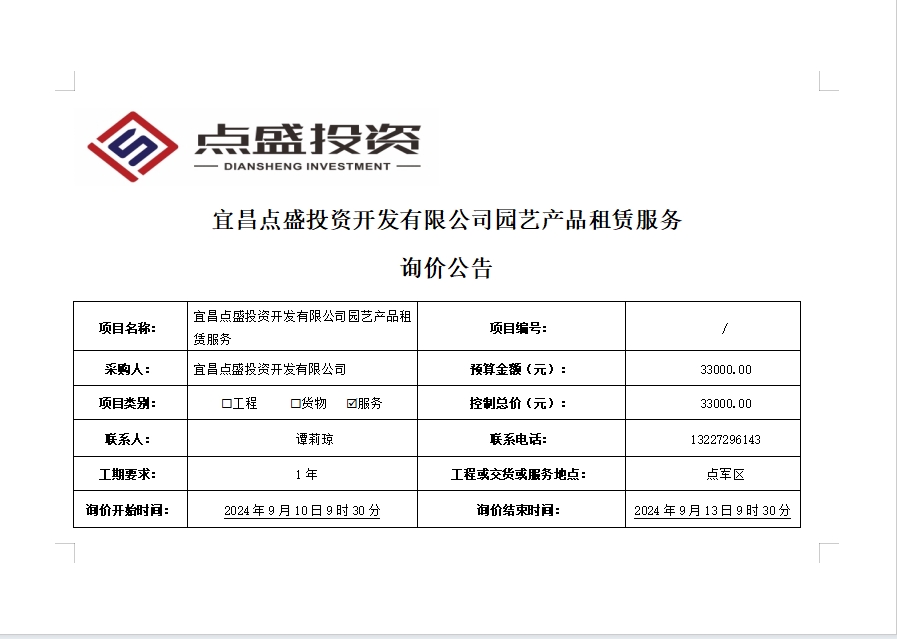 宜昌點(diǎn)盛投資開發(fā)有限公司園藝產(chǎn)品租賃服務(wù)詢價(jià)公告