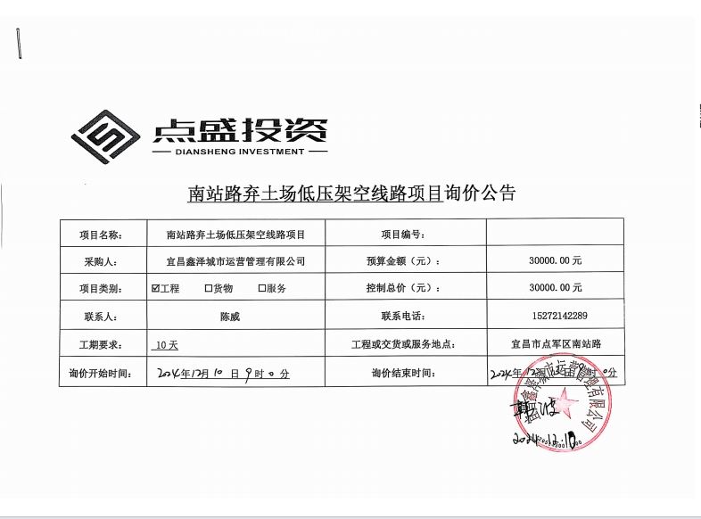 南站路棄土場(chǎng)低壓架空線路項(xiàng)目詢(xún)價(jià)公告