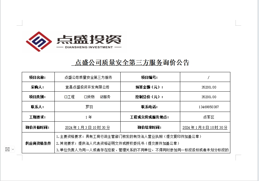 點(diǎn)盛公司質(zhì)量安全第三方服務(wù)詢價(jià)公告